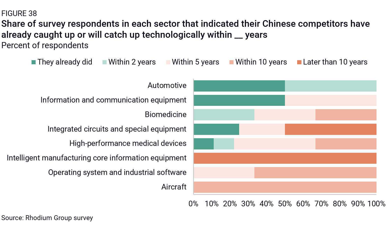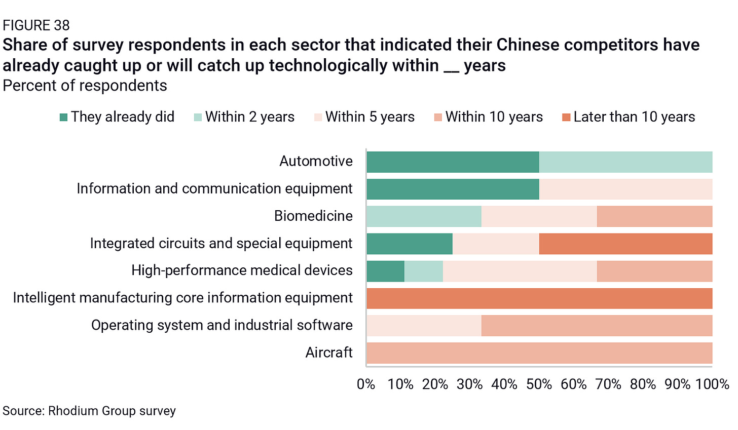 中国进步的另一个限制是,虽然中国公司一直在努力迎头赶上,但外国技术在许多领域不断进步。2015 年,商业生产中最先进的半导体节点是 14 纳米,10 纳米技术仍在开发中,尚未广泛使用。当被调查为他们预计中国竞争对手何时在各自领域达到同等水平时,62% 的外国公司预测这将在 5 到 10 年内实现。在涵盖的行业中,汽车行业脱颖而出,因为中国竞争对手被认为已经或预计最快赶上(图 38)。在集成电路领域,一半的受访者表示,他们预计中国竞争对手将在 10 年内迎头赶上。这与信息技术与创新基金会对中国创新进展的研究结果一致并相辅相成,该研究发现中国在机床、半导体、生物制药和化工方面落后;在机器人技术方面几乎持平。然而,这种形势正在迅速变化,其中许多差距可能不会持续很长时间。例如,如上所述,中国正在迅速成为生物制药领域的独立创新者。