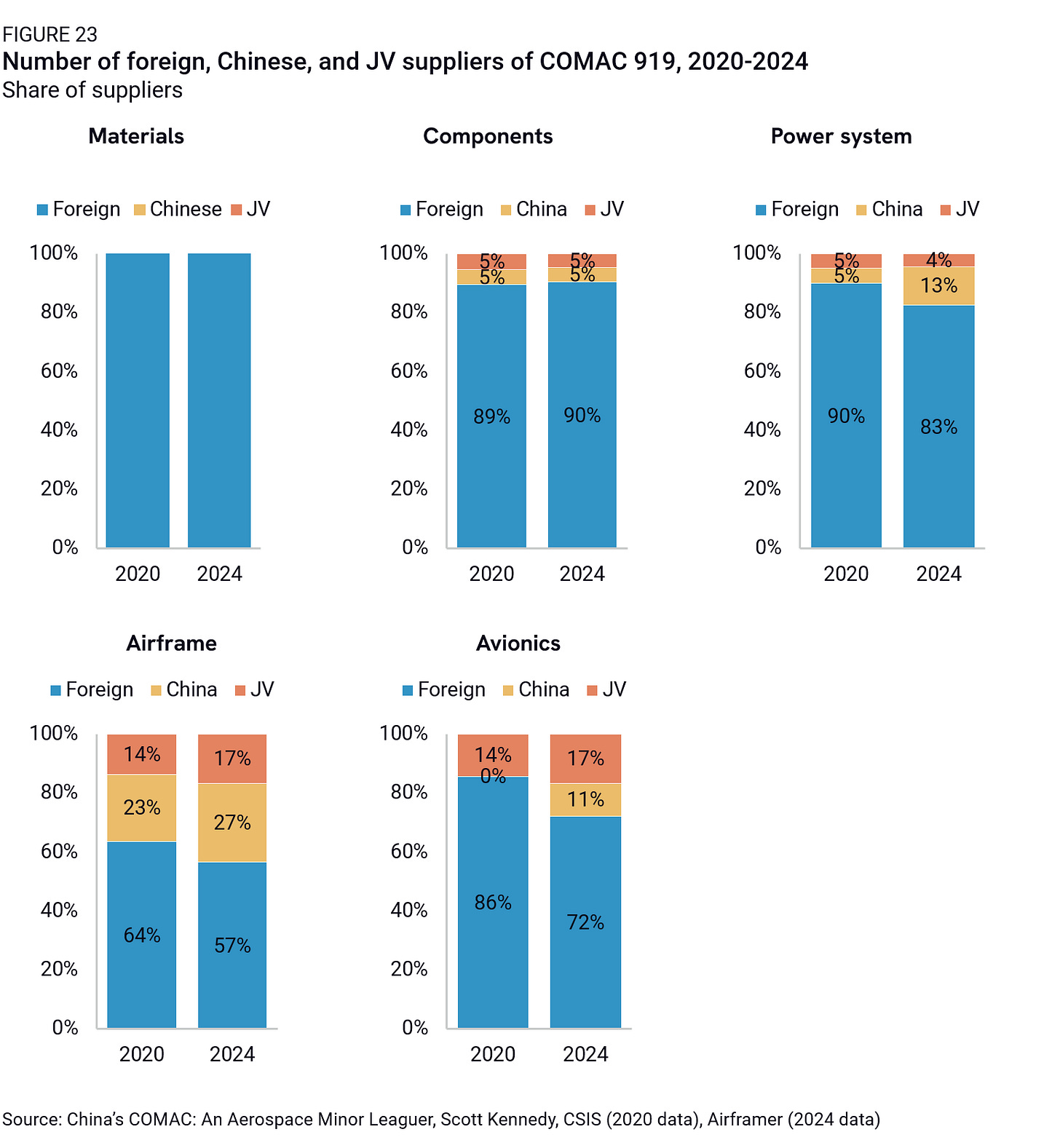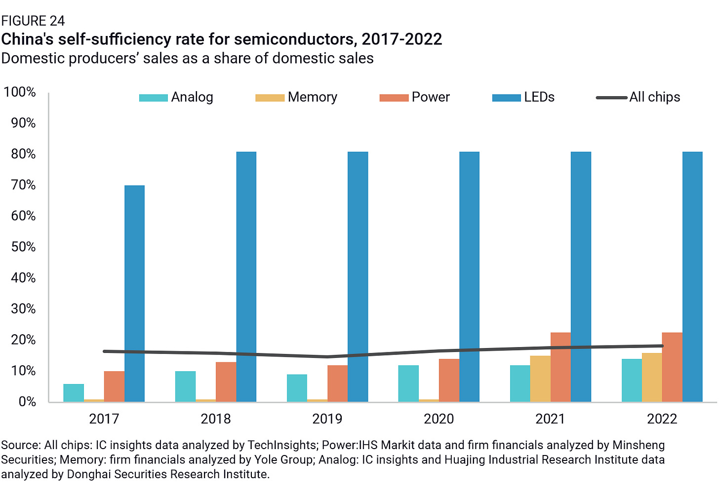 尽管取得了这些进步,但中国仍远未实现其预期的自给自足。外国公司继续在半导体制造设备、高端仪器和先进航空航天部件等关键领域占据主导地位,并将最先进的知识产权和技术保留在中国境外。这造成了很大的依赖性,尤其是在机床和尖端半导体等行业,在这些领域,进口对于最先进的组件仍然是必不可少的。在包括高端半导体、医疗设备和航空航天设备在内的大多数领域,中国公司在收入、市场份额和技术成熟度方面也落后。