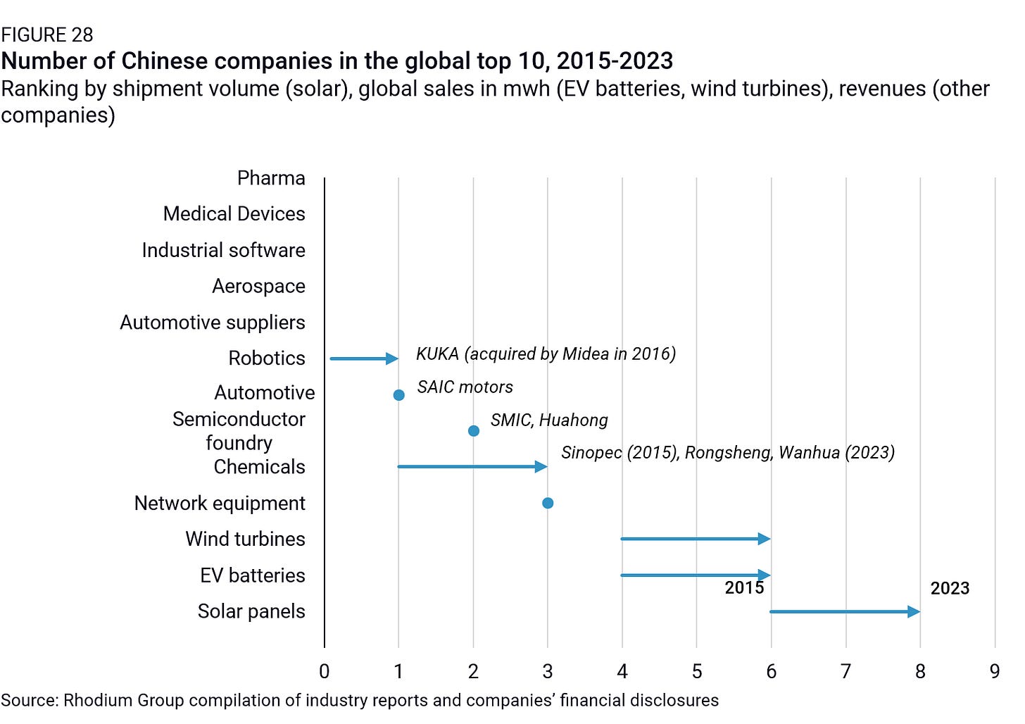 在光传输和网络接入设备方面,中国长期占据主导地位,华为、中兴和烽火通信位居全球前十。也就是说,他们的立场在过去十年中基本保持不变。在化工领域,中国企业的产量和收入都大幅增加。虽然中石化在 2015 年已经跻身前十名,但后来专门从事高价值化工产品的熔盛和万华也加入了这一行列。在半导体和汽车领域,截至 2015 年的领先公司(中芯国际、华虹和上汽集团)仍然处于领先地位,但没有新的中国企业领导者进入前十名。在机器人技术领域,中国的地位只是在 2016 年美的集团收购德国制造商 KUKA 后发生了变化。