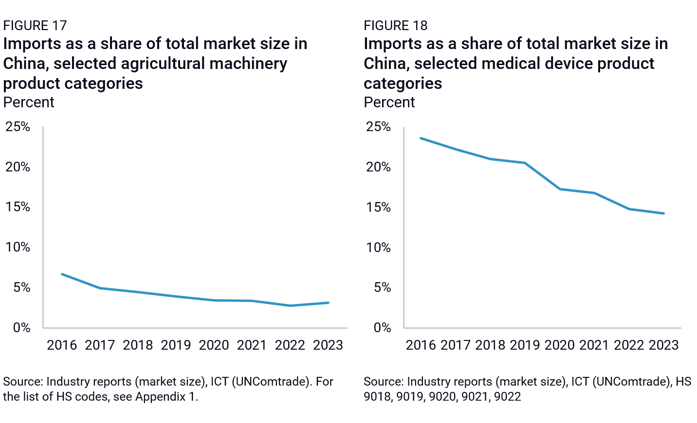 MIC25 的主要目标之一是通过培养国内参与者或吸引外国公司在中国实现生产本地化来消除对进口的依赖。“中国制造”产品的目标(无论其是由国内公司还是外国公司生产)在路线图中针对 IT、发电和医疗设备等关键行业设定了目标。第 3 章将更具体地关注国内企业在中国获得市场份额方面取得的成就,而本章则侧重于外国公司在减少中国进口依赖性方面的作用。