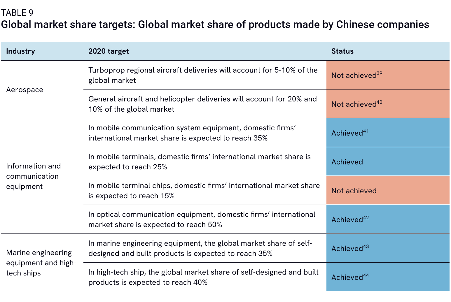 造船、ICT 设备和航空航天是 MIC25 路线图为全球市场份额设定明确量化目标的三个领域。这些目标中的大多数都实现了,但在移动终端芯片和航空航天领域有明显的例外(表 9)。中国的涡轮螺旋桨飞机和直升机行业落后于全球领导者,2021 年空客、贝尔、莱昂纳多和罗宾逊仍占全球民航直升机市场的近 97%。