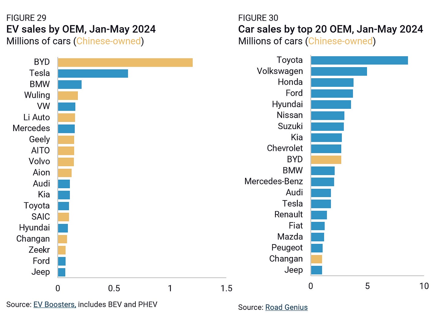 中国电动汽车公司和电动汽车电池制造商都受益于这种不断增长的国家支持和保护需求。到 2024 年初,中国电动汽车制造商将占全球市场份额的 58%(图 29)。中国参与者还占全球电池产能的 85% 左右,并在锂、钴和石墨加工等电动汽车电池价值链的关键要素方面主导全球市场。如今,许多分析师认为中国的电池和电动汽车在技术上领先于全球同行,这反映了多年战略性产业政策和投资的累积影响。