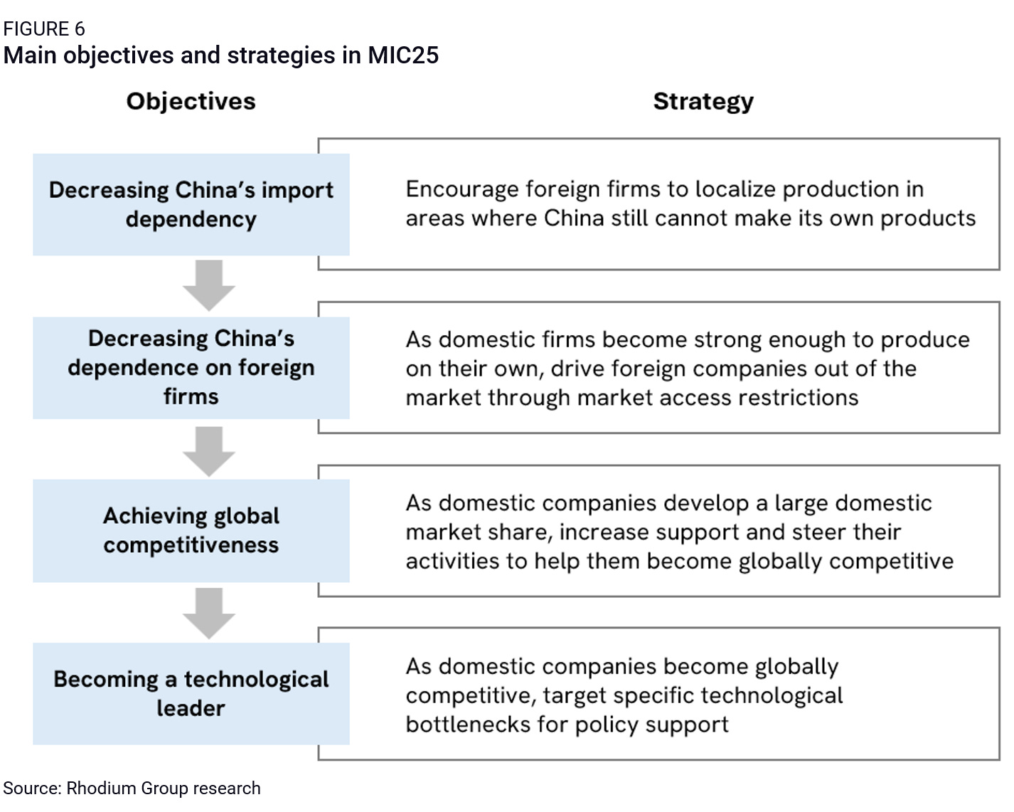 虽然这些目标是相互关联的,但每个目标在概念上都是不同的。例如,中国可能会降低对进口的依赖,同时仍然依赖外资企业在国内生产。同样,它也可以通过可能尚未具有全球竞争力或可能生产低质量产品的本地公司来满足国内需求——即使中国在中国大市场的本地主导地位是全球竞争力的跳板。每个目标都需要量身定制的策略来实现特定结果,如图 6 所示。