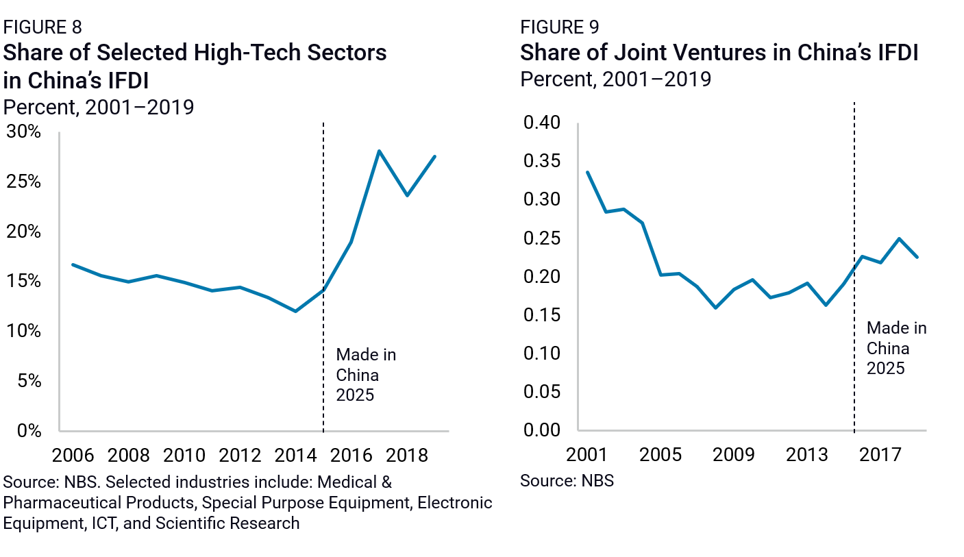 然而,中国有针对性的本地化战略,要求外国公司建立合资企业或采用更“本地”的足迹,以继续充分进入中国市场,这有助于确保外国投资与中国的自给自足目标保持一致。有证据表明(尽管我们只有截至 2019 年的数据)这些本地化要求对外国投资产生了切实影响。例如,集中在 MIC25 涵盖的高科技行业的入境 FDI 份额在 2015 年后跃升,在几年内几乎翻了一番(图 8)。同期,合资企业(通常允许更多的知识产权转让)在对华外国直接投资总额中的份额在连续几年下降后有所回升(图 9)。