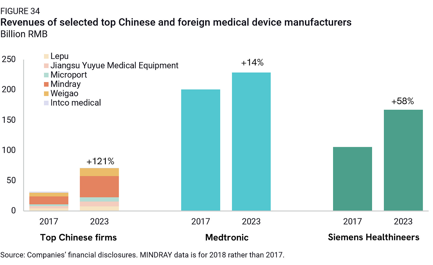 与机器人行业一样,中国医疗器械公司的全球收入仍然落后于同行,尽管它们的增长速度更快(图 34)。2017 年至 2023 年期间,中国顶级制造商乐普、江苏宇跃医疗设备、迈瑞、英科医疗、微创和威高的总收入增长了一倍多。也就是说,它们的总收入仅相当于美国医疗设备制造商美敦力的 30%。