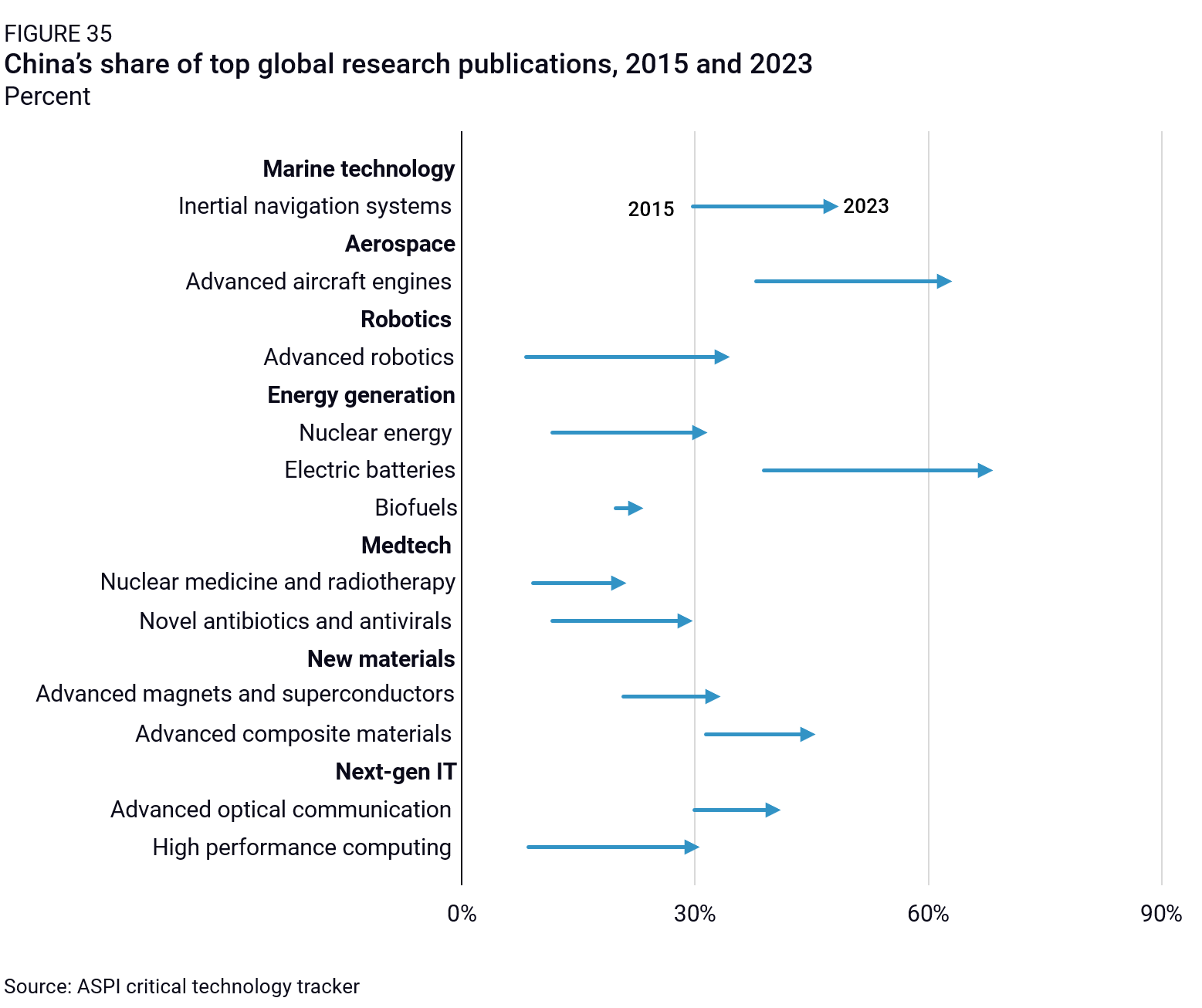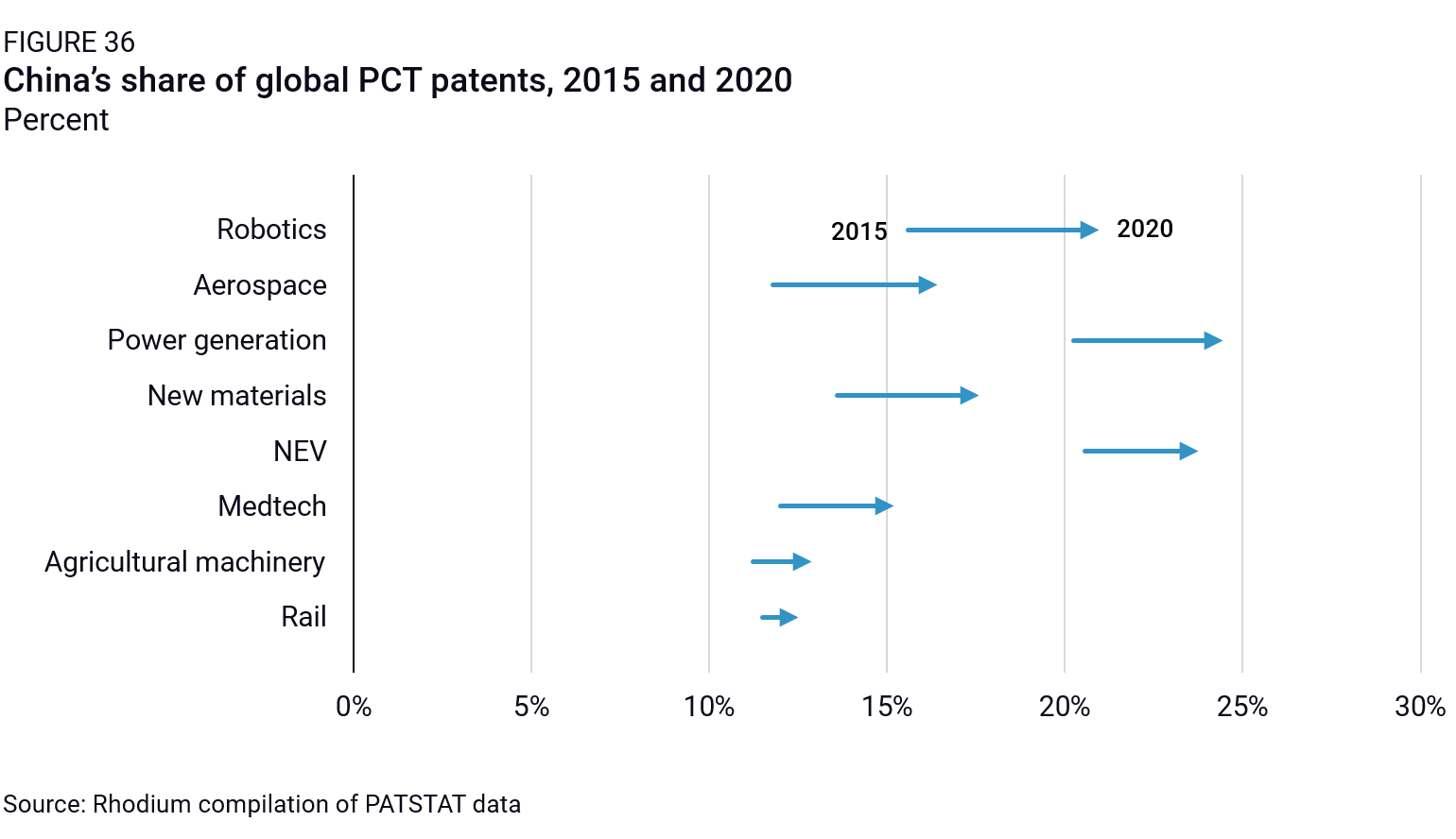 中国在缩小与外国公司的差距和技术前沿方面取得了长足的进步。总体而言,现有的技术分析表明,中国正在利用巨大的势头缩小与美国和日本等领先国家的差距,并且已经在一些创新产出指标上领先。2023 年,中国媒体广泛报道称,2018 年被《科技日报》列为主要“瓶颈”技术的 35 项关键技术中,中国企业已经掌握了 21 项。这些掌握的技术包括水下连接器、激光雷达、手机射频设备和隧道掘进机的主轴承等。