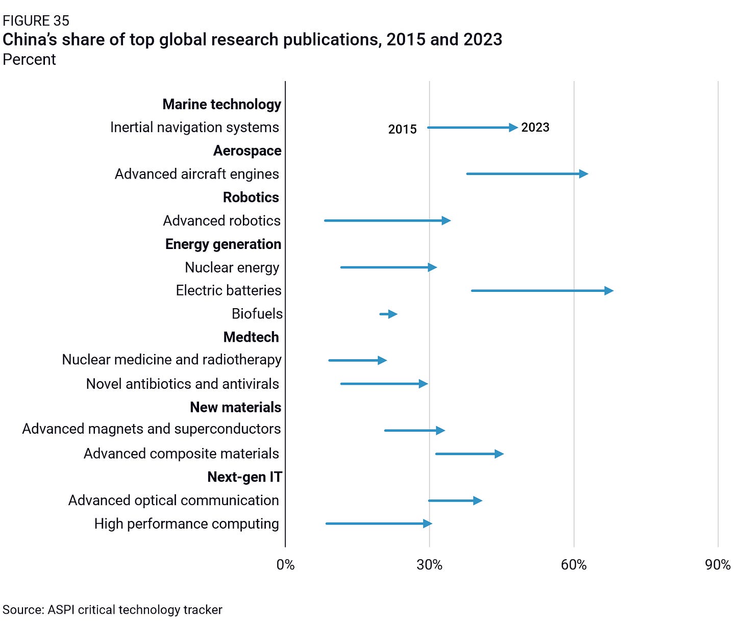 此外,跨行业的重叠技术成就可以说已经产生了一种强化效应,将在未来几年扩大中国的进步和对全球供应链的控制。先进材料、半导体和人工智能等基础技术的优势促进了机器人、新能源汽车和电信等下游应用的进步。这些可能会在未来继续加速创新和竞争力,并可能使中国加深其在全球广泛战略领域的影响力。