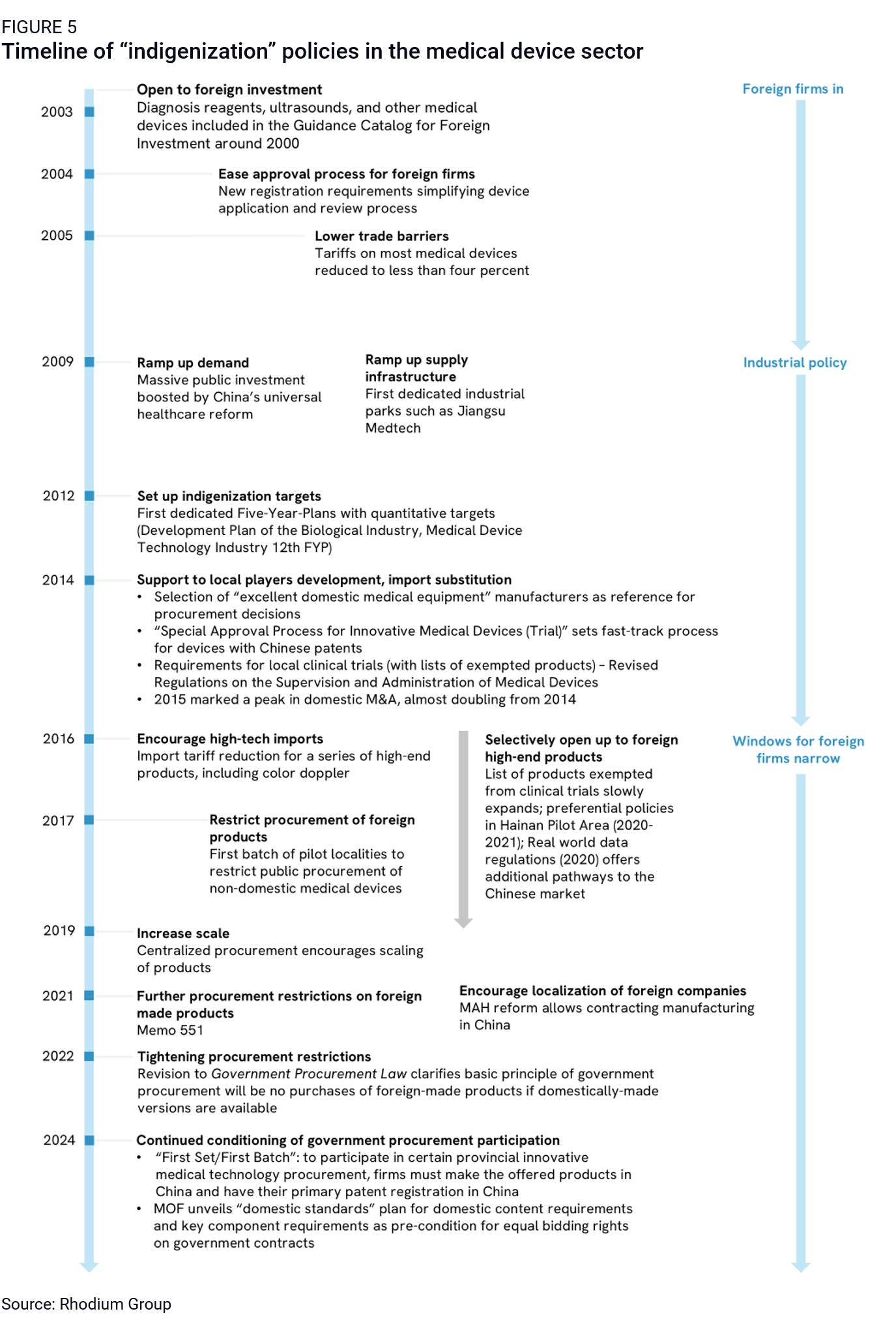 医疗器械行业就是一个很好的例子。正如 2019 年的一篇论文所指出的那样,“进入中国医疗器械市场从来都不是一件容易的事,但近年来它变得越来越具有挑战性。2014-2015 年后,旨在迫使外国公司将高科技生产和研究本地化并将其挤出本地参与者足以竞争的细分市场的政策愈演愈烈(图 5)。