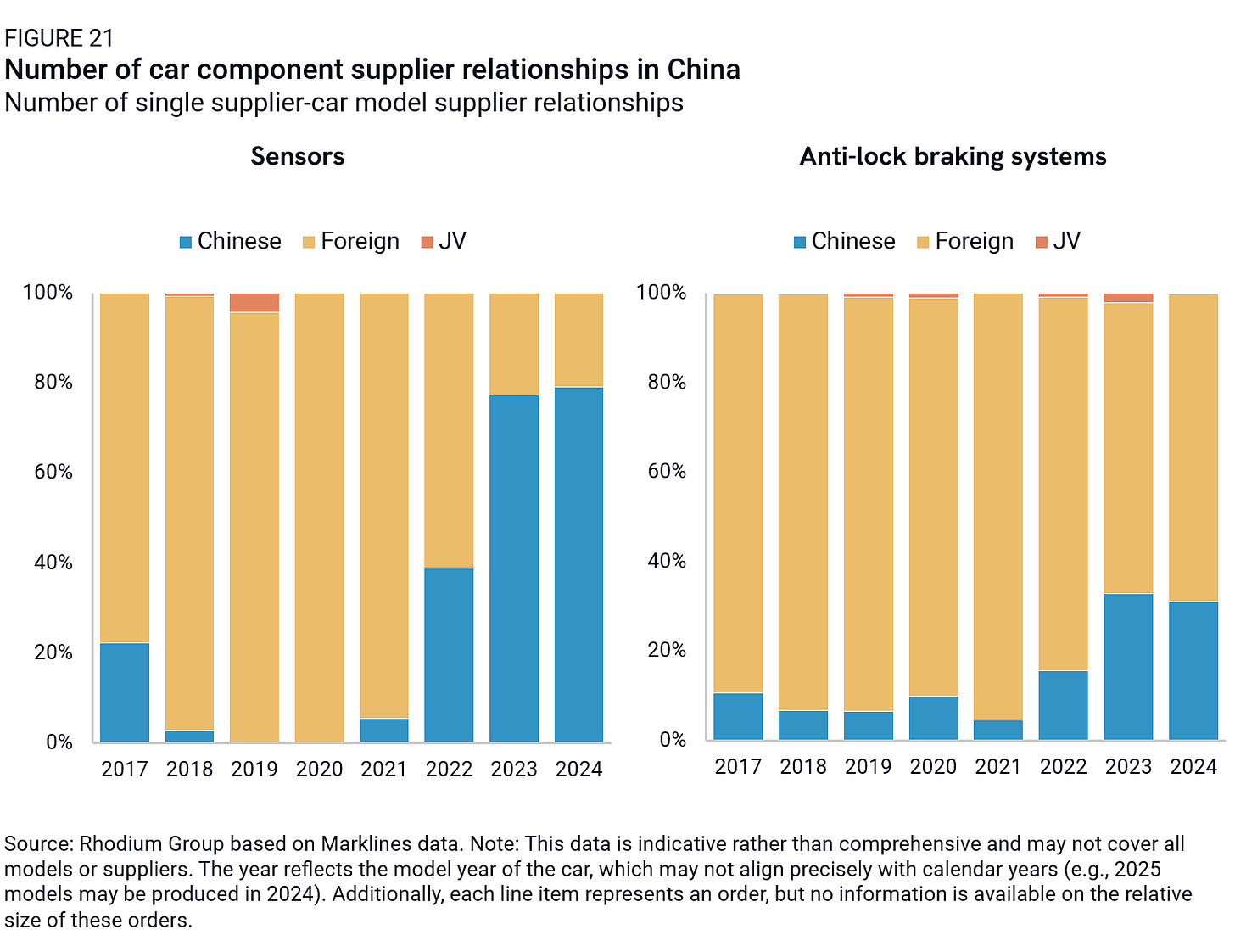 另一方面也有例外,由于优先考虑国内供应商的政策,中国已经实现了显著的自给自足,但这并不一定转化为全球竞争力。例如,在汽车天线和远程信息处理等领域,对本地采购的关注已经建立了国内产能,但尚未生产出在国际市场上有效竞争的产品。这表明,在国内政策激励和优先考虑本地供应商的压力推动下的自给自足和进口替代并不会自动转化为全球竞争力。