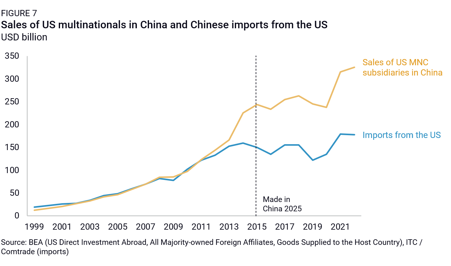 从 2015 年到 2023 年,美国跨国公司在中国的子公司(有很好的可用数据)的研发支出和附加值产出分别增加了 77% 和 43%。虽然这一增长低于前七年期间的 105% 和 156%,但它仍然是一个显着的增长。值得注意的是,尽管地缘政治紧张局势不断升级,但自 2020 年以来,美国跨国公司加快了在中国的增值生产和研究投资的本地化。此外,美国子公司在中国的销售额增长与美国对中国的出口停滞不前相吻合,这凸显了本土化工作增加推动进口替代的作用(图 7)。