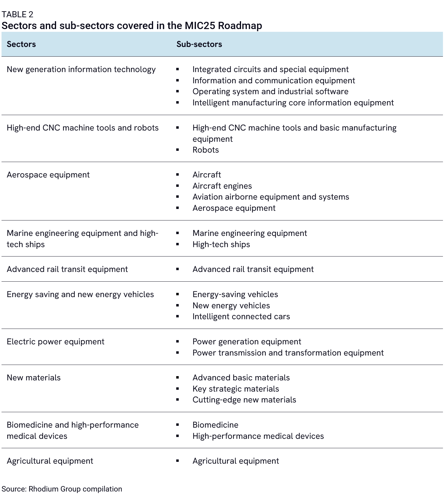 虽然全面,但最初的 MIC25 计划特别强调了三种政策方法:加强政策实施(通过国家建设中国制造强国领导小组等机构);通过制造业的竞争性和对中小企业的支持,使市场环境更具竞争力;以及有针对性的财政援助,包括风险投资、贷款和扩大财税政策资金。