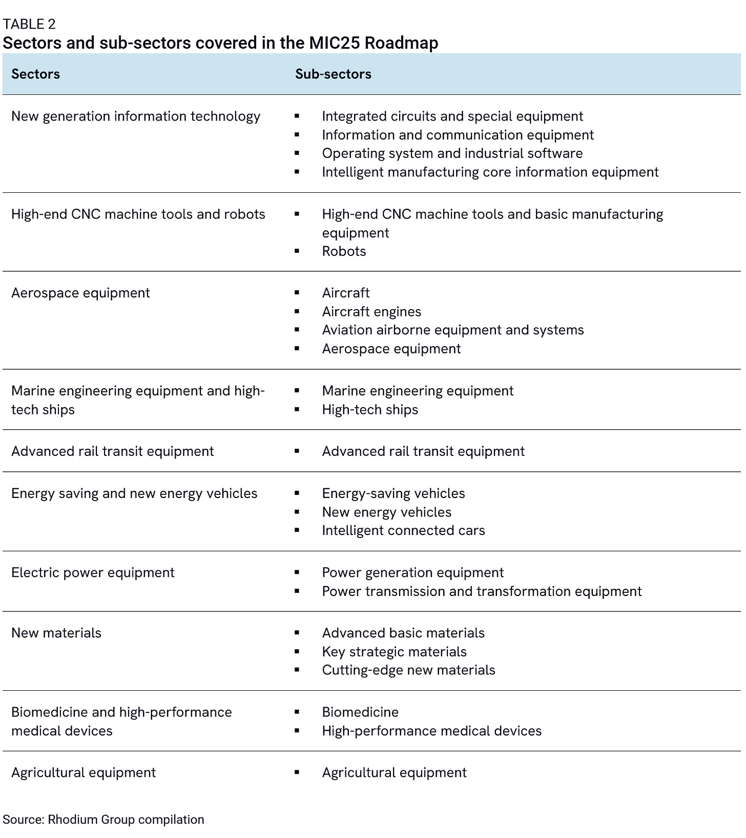 2015 年,中国公布了“中国制造 2025”(MIC25) 战略,这是一项为期十年的蓝图,旨在将中国转变为先进制造业的全球领导者。这项综合规划针对十个战略产业,包括下一代信息技术、航空、铁路、车辆、先进医疗技术和农业机械等。与该计划相辅相成的是《中国制造 2025 重大技术路线图》,其中概述了关键部门的市场份额、国内自给自足和技术发展的详细、量化目标。