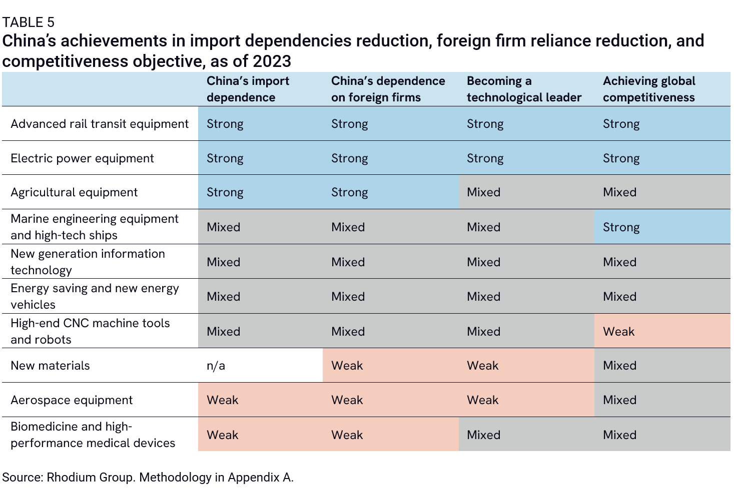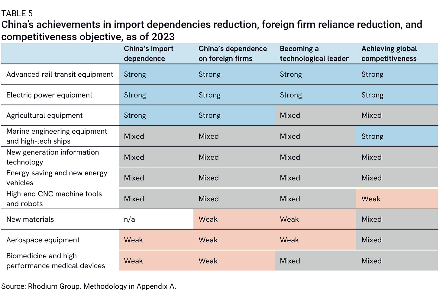 如表 5 所示,主要评估截至今天的进展情况。然而,需要注意的是,该表显示了一个平均值,它结合了每个行业内各个产品类别的进度指标,这可能会掩盖关键的细微差别。例如,尽管中国在先进轨道交通设备和电力设备等领域在各个方面都取得了强劲的成绩,但在高端数控机床和航空航天设备等领域的进展仍然很缓慢。一些行业的进展喜忧参半,例如新一代信息技术、生物医学和海洋技术。根据 2025 年欧盟商会的一份报告,中国在电信设备领域处于领先地位,即 MIC25 行业,其中外国公司比例最高 (44%) 表示,中国竞争对手能够以相当或更低的价格生产同等或更优质的产品。相比之下,半导体和作系统仍然是中国最容易受到攻击的领域之一。14 同样,海洋工程设备显示出强大的全球竞争力,但在减少对进口的依赖和对外国公司的依赖方面,结果喜忧参半。每章都提供了不同产品类别的详细讨论。在可能的情况下,每章还讨论了相对进展和可能的未来进展,以衡量中国本土工业的发展速度。