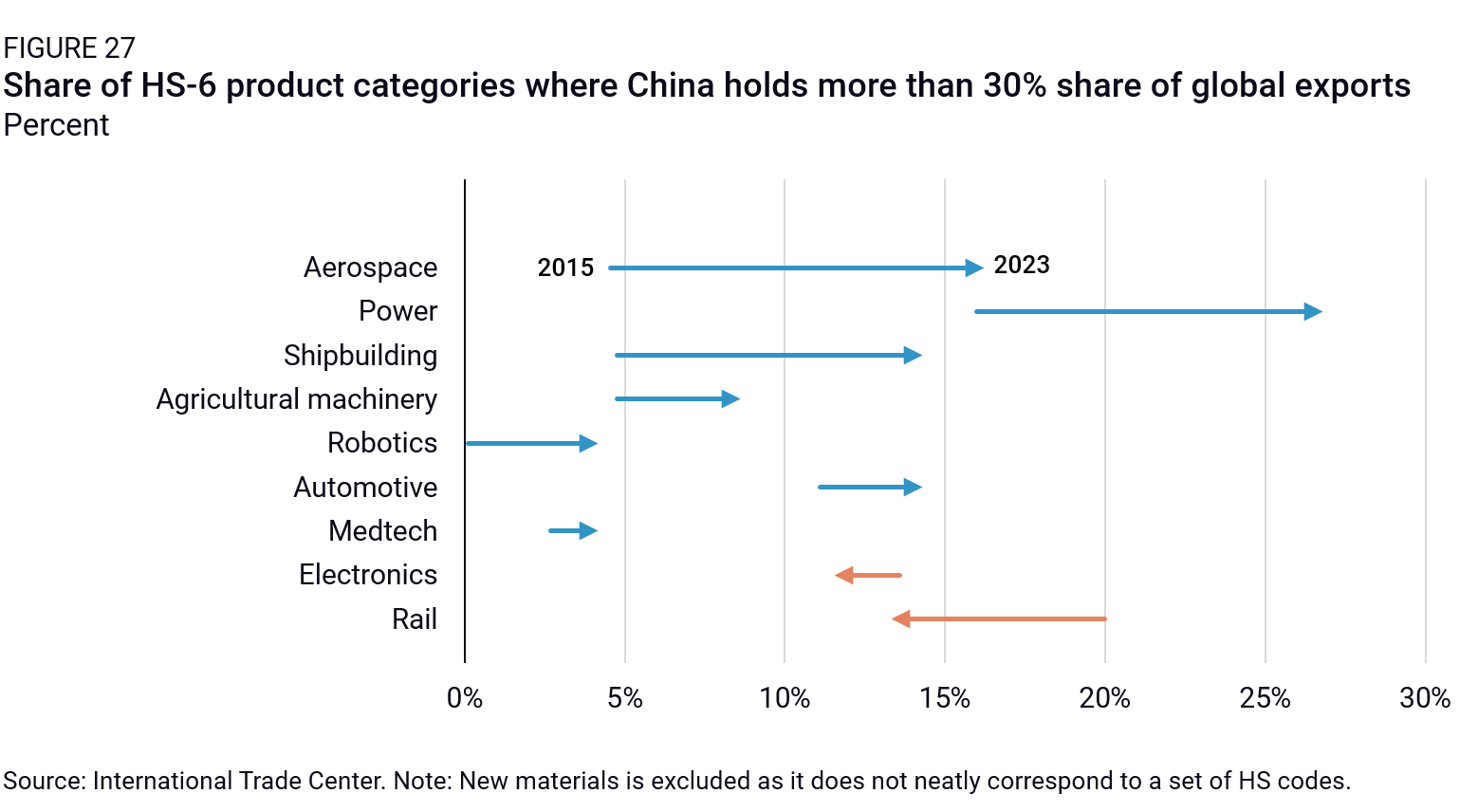 评估中国在 MIC25 领域的全球竞争力的另一种方法是检查中国在全球出口中占很大份额的产品数量。该指标的结果与全球整体出口份额的趋势密切相关,但有一个明显的例外:航空航天(图 27)。中国是无可争议的全球无人驾驶飞机领导者。尽管机器人技术行业自 2015 年以来取得了更大的进步,但机器人技术和医疗技术仍然是中国主导地位有限的行业,并且医疗技术行业的综合数据掩盖了其子行业(例如消费品、植入式设备和医疗设备)内部的差异。在机器人技术方面,中国占全球出口份额超过 30% 的 HS-6 产品类别的份额从 2015 年的 0% 上升到 2023 年的 4%。农业机械和造船业也出现了大幅增长,在中国主导的产品类别中的份额分别上升到 9% 和 14%。在中国主导的产品类别中,唯一下降的是铁路和电子产品。