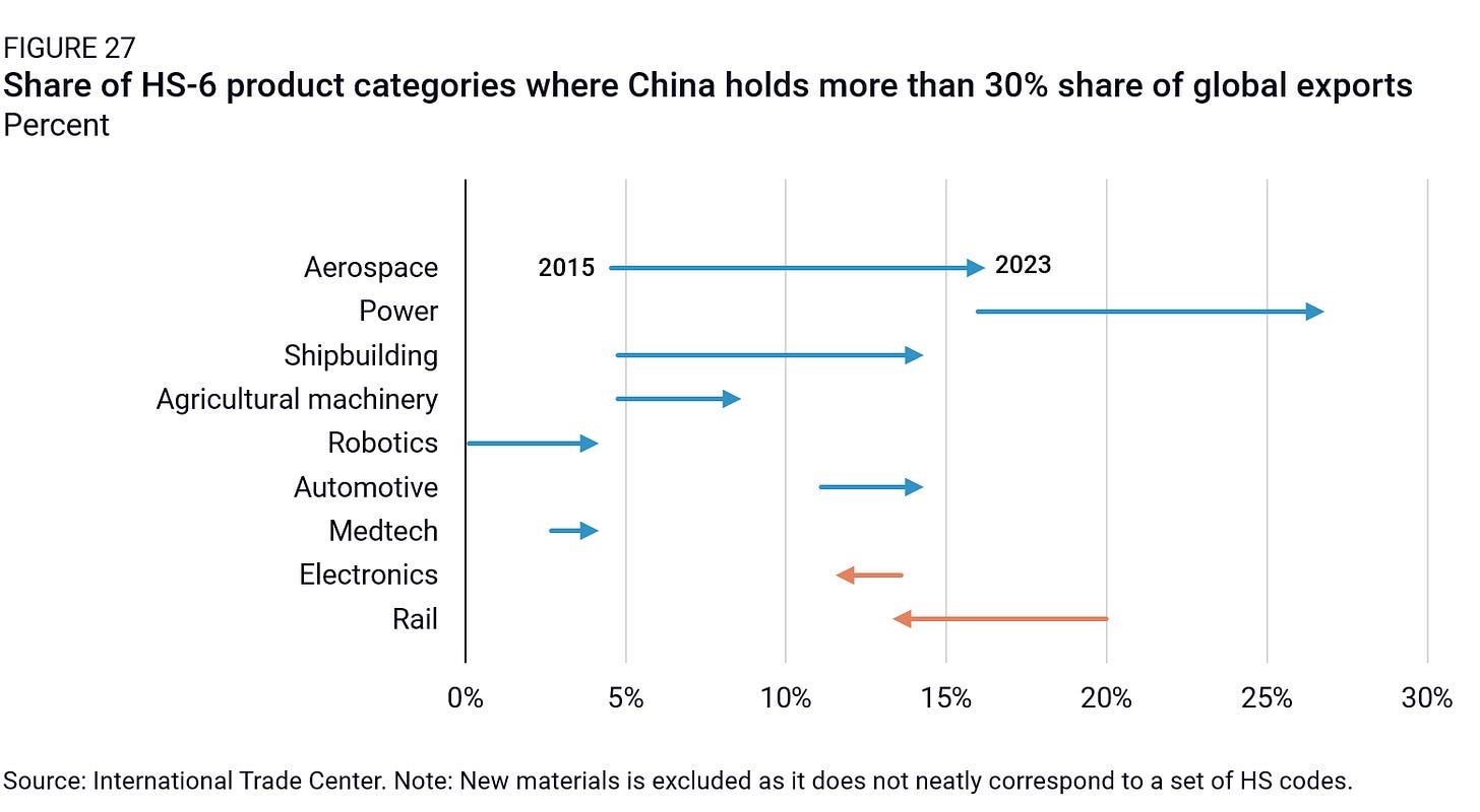 在大多数行业,中国在全球出口中的份额增长速度快于MIC25战略未涵盖的其他行业(图26)。2015 年至 2023 年,发电和输电行业的增长尤为强劲,中国在全球出口中的份额从 28% 增长到 40%,汽车行业的中国份额从 3% 增长到 9%。中国在航空航天和医疗技术领域的全球出口份额仍不到其全球所有制成品出口份额 (19%) 的四分之一。