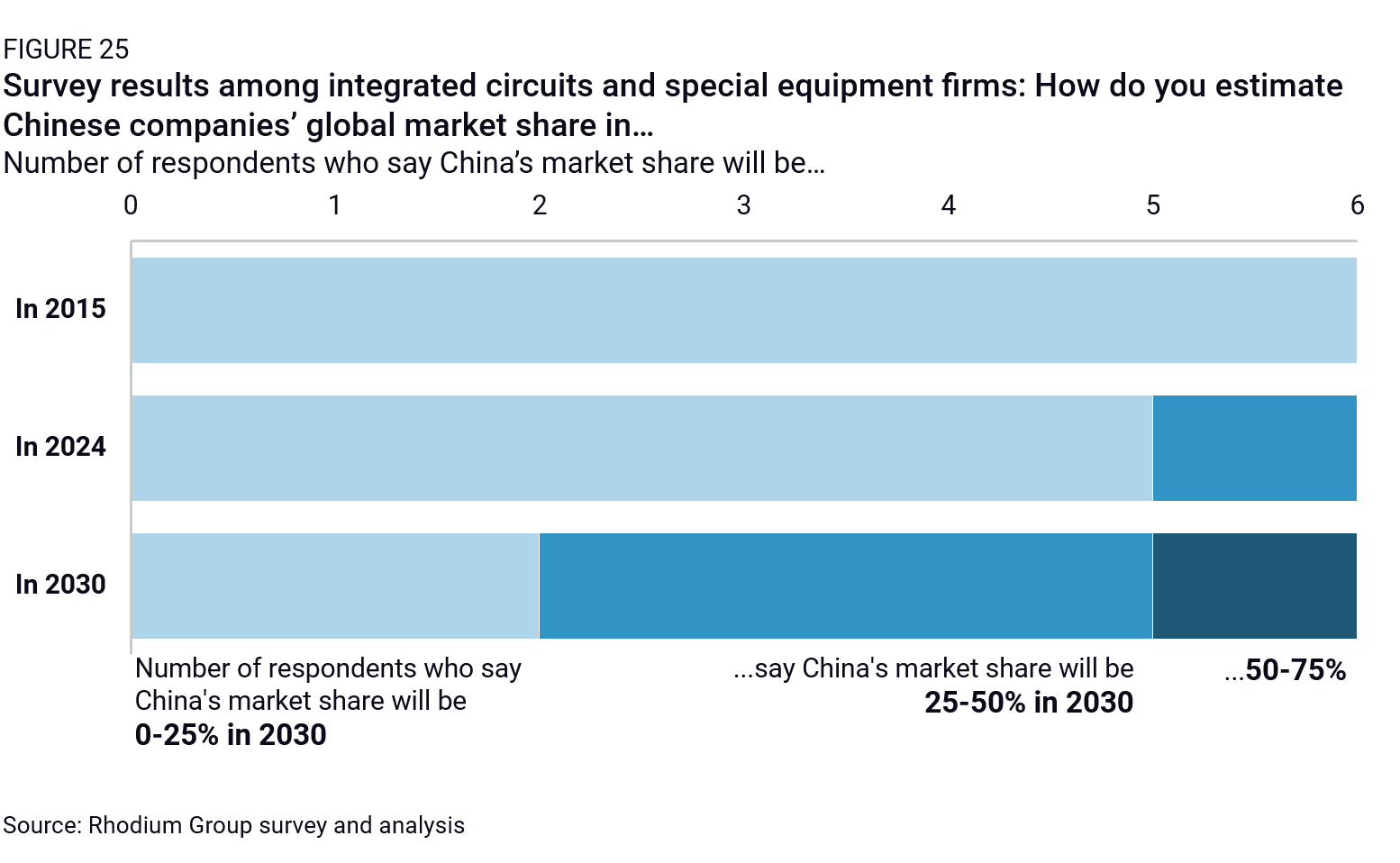 尽管如此,中国传统芯片的大量产能建设正在挑战外国公司的市场份额。在过去十年中,中国的传统代工厂受益于软预算限制,在此期间中国国内电子产品需求的大幅增长也推动了它们的增长。中国在 20-40nm 工艺节点上制造的半导体产能扩张最快,这些工艺节点在微控制器和许多低功耗物联网芯片中非常受欢迎。因此,外国集成电路和专用设备公司的受访者表示,到 2030 年,国内公司在中国的市场份额可能会增加到 25-50%,如果不是 50-75%,尽管这些预测没有区分传统芯片和先进半导体(图 25)。
