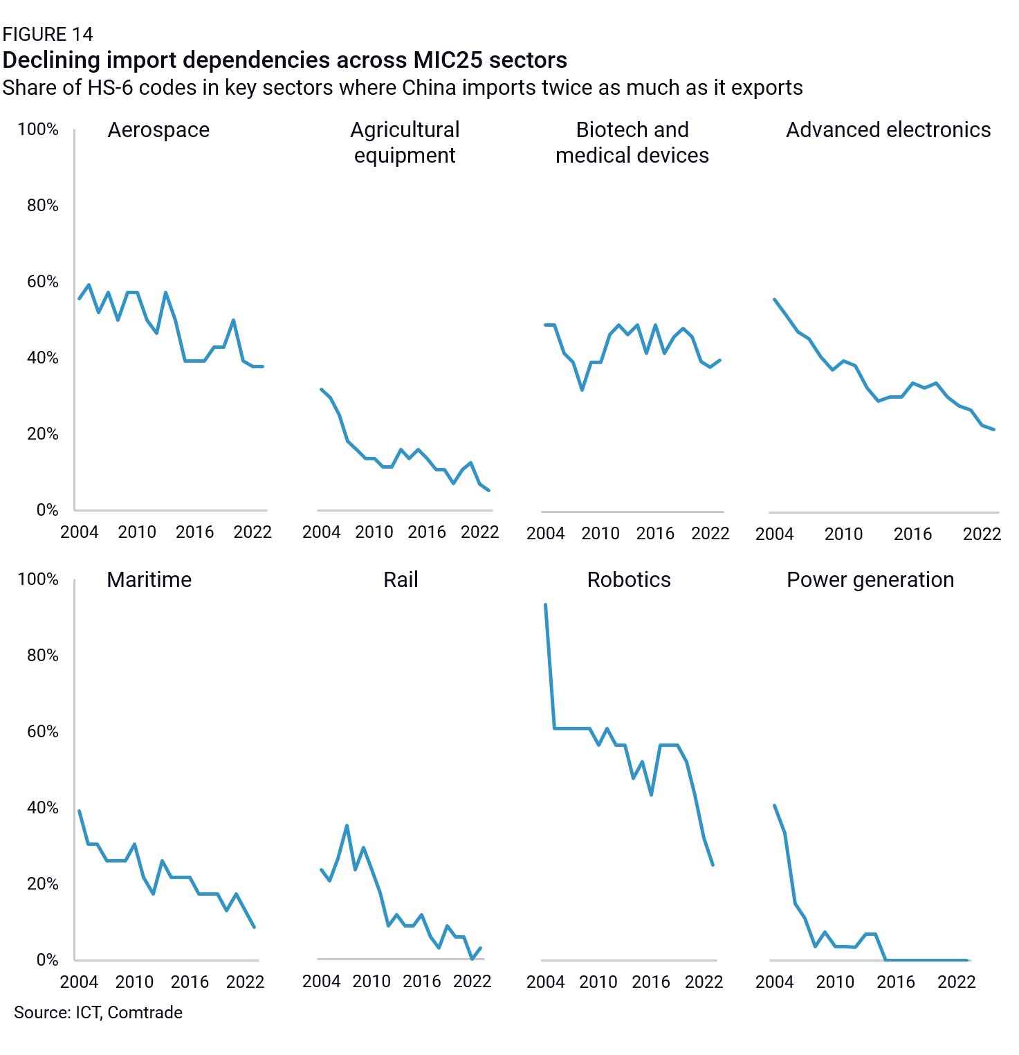 我们对 MIC25 迄今为止结果的评估表明,该政策推动了大型工业部门建设的实质性进展,尽管这种成功已被持续的依赖所缓解,尤其是在高科技零部件和专业进口方面。与此同时,中国成功地创造了反向依赖——世界越来越依赖中国公司和中国生产的领域。虽然中低技术领域长期以来一直如此,但现在它正在扩展到电动汽车、太阳能和电信等高科技领域,并正在重塑从清洁技术到机器人技术的行业竞争态势。