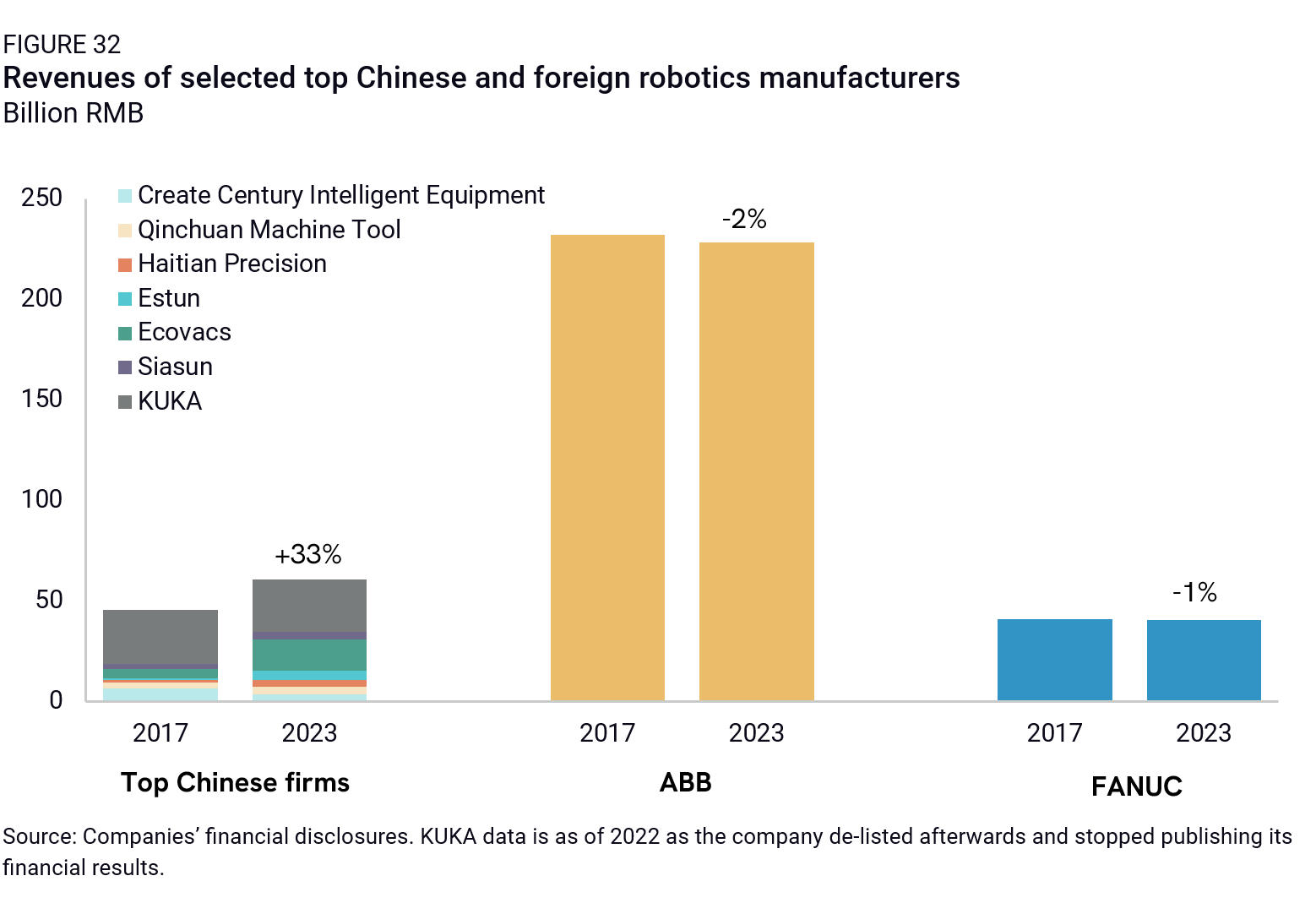 与全球领导者 ABB 和 FANUC 相比,中国领先的机器人制造商的总收入规模较小,这反映了它们的疲软(图 32)。2017 年至 2023 年期间,中国制造商 Create Century Intelligent Equipment、秦川机床、海天精工、Estun、Ecovacs 和 Siasun 的总收入增长了 84%。加起来,它们仍然只带来了 ABB 2023 年收入的 15%。