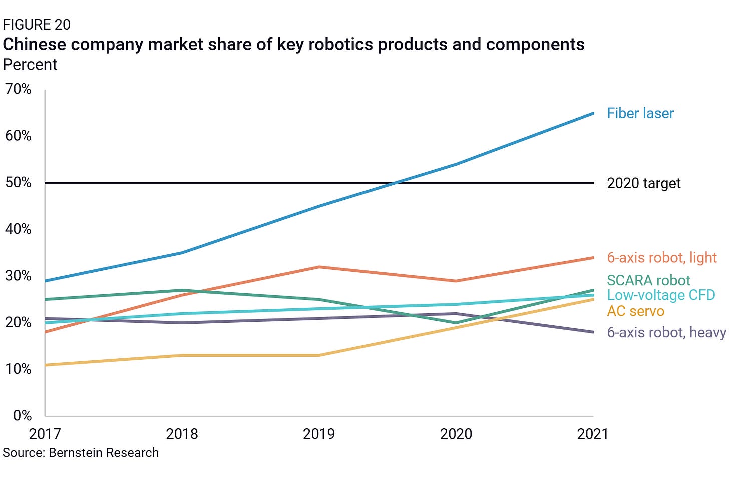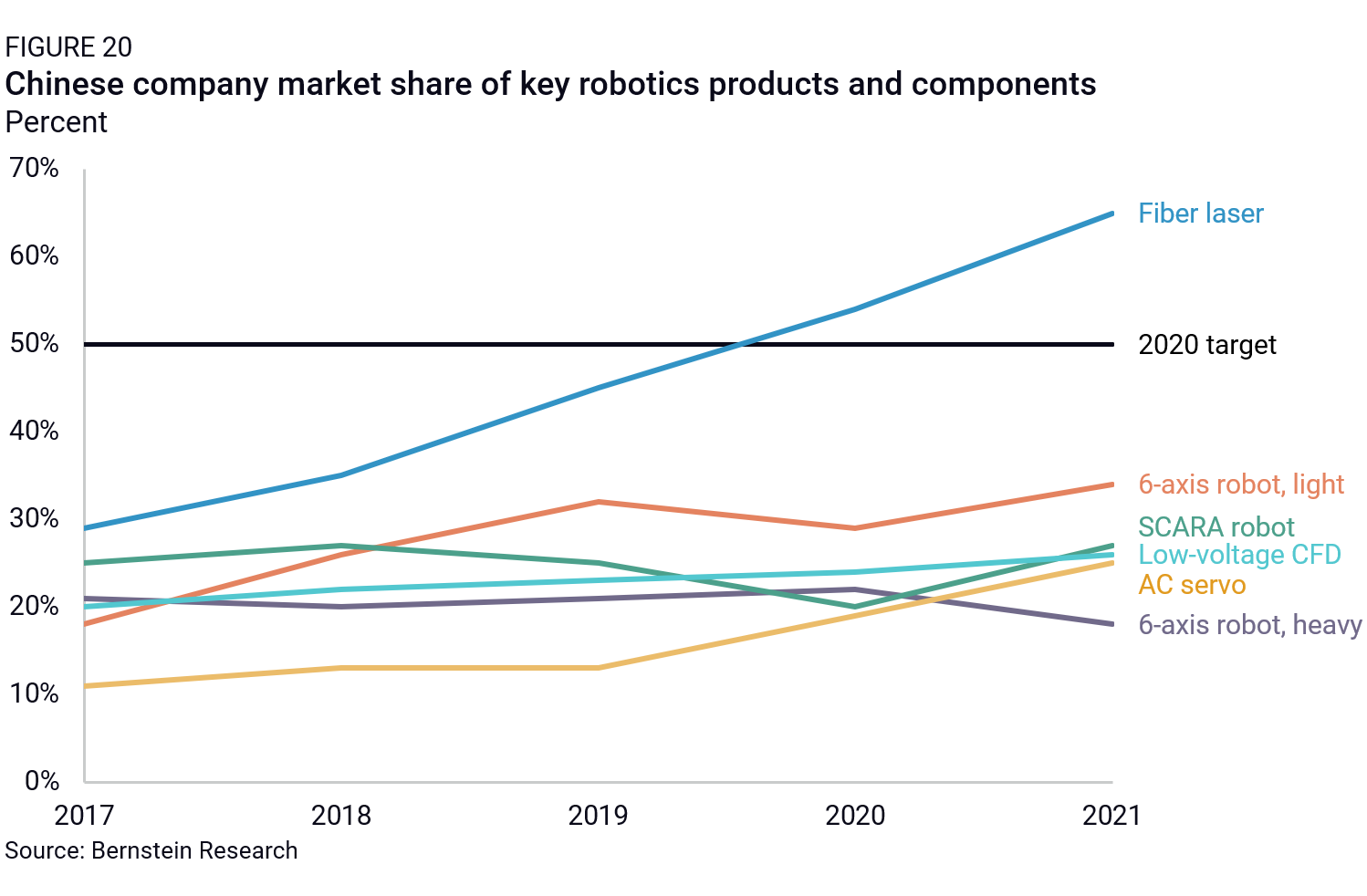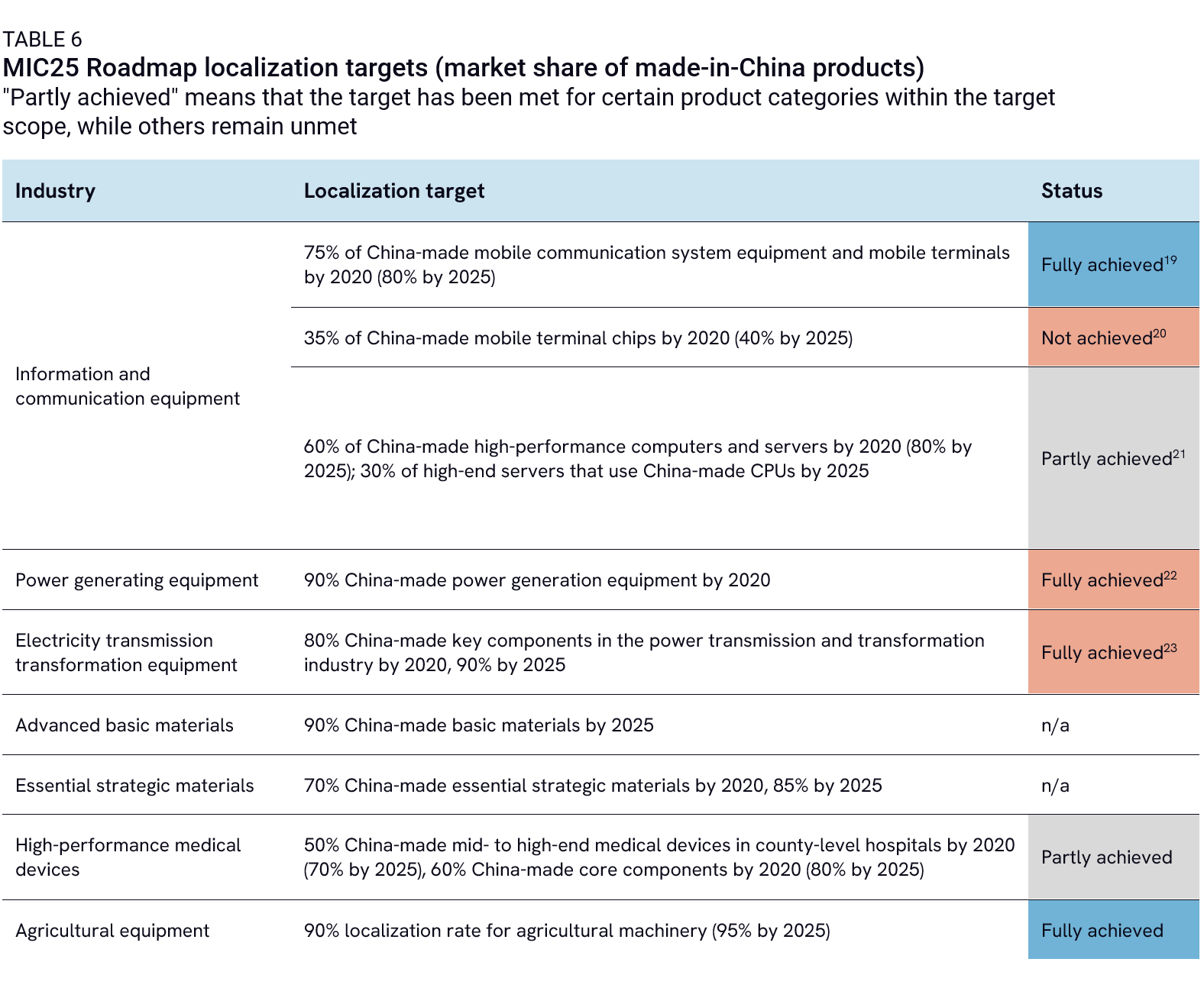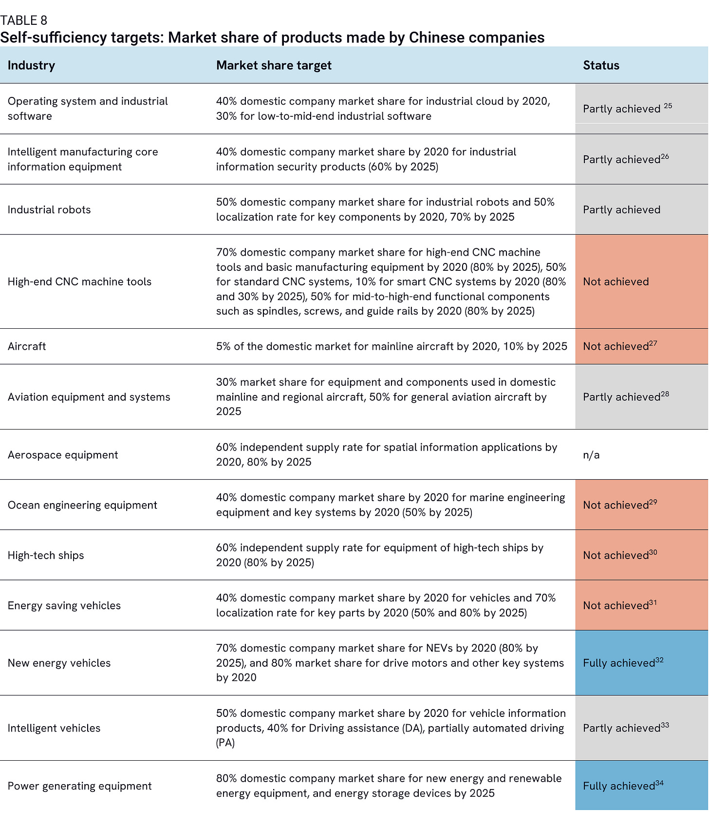 MIC25 的另一个目标是让中国公司实现全球竞争力,通过市场份额或技术领先地位来衡量。这代表了该战略的最终目标之一:将中国从“世界工厂”转变为全球创新领导者和先进制造强国。与自给自足的目标相比,北京为实现全球竞争力采用了更长的时间表。虽然 MIC25 计划的目标是到 2025 年中国在核心零部件和关键材料方面实现 70% 的自给自足,但它设想到 2049 年中国成为“全球制造的前沿”并发展“世界领先的技术和工业体系”,恰逢中华人民共和国成立 100 周年。