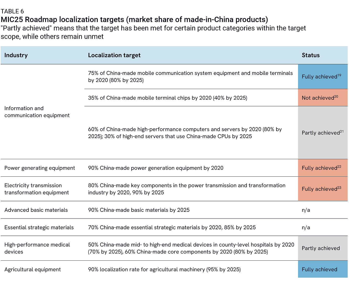 该计划的核心是逐渐用中国公司在中国制造的产品取代进口和外国公司的产品。MIC25 概述了到 2025 年,中国的目标是在核心基础零部件和关键基础材料方面实现 70% 的自给自足。到 2049 年(建国 100 周年),中国应该走在世界制造业强国的前列。该战略强调“自主创新”和“自给自足”,重点控制关键核心技术和加强工业供应链,以确保国家经济和安全韧性。与 MIC25 计划一起发布的关键技术路线图中,自给自足的雄心更为明显,其中包括每个行业中国制造和中国制造产品的市场份额的详细目标。尽管工业和信息化部 (MIIT) 声称该路线图纯粹是科学性的,非政策驱动的,但该路线图被广泛认为是一份政治指导文件,得到了政府最高层的认可。