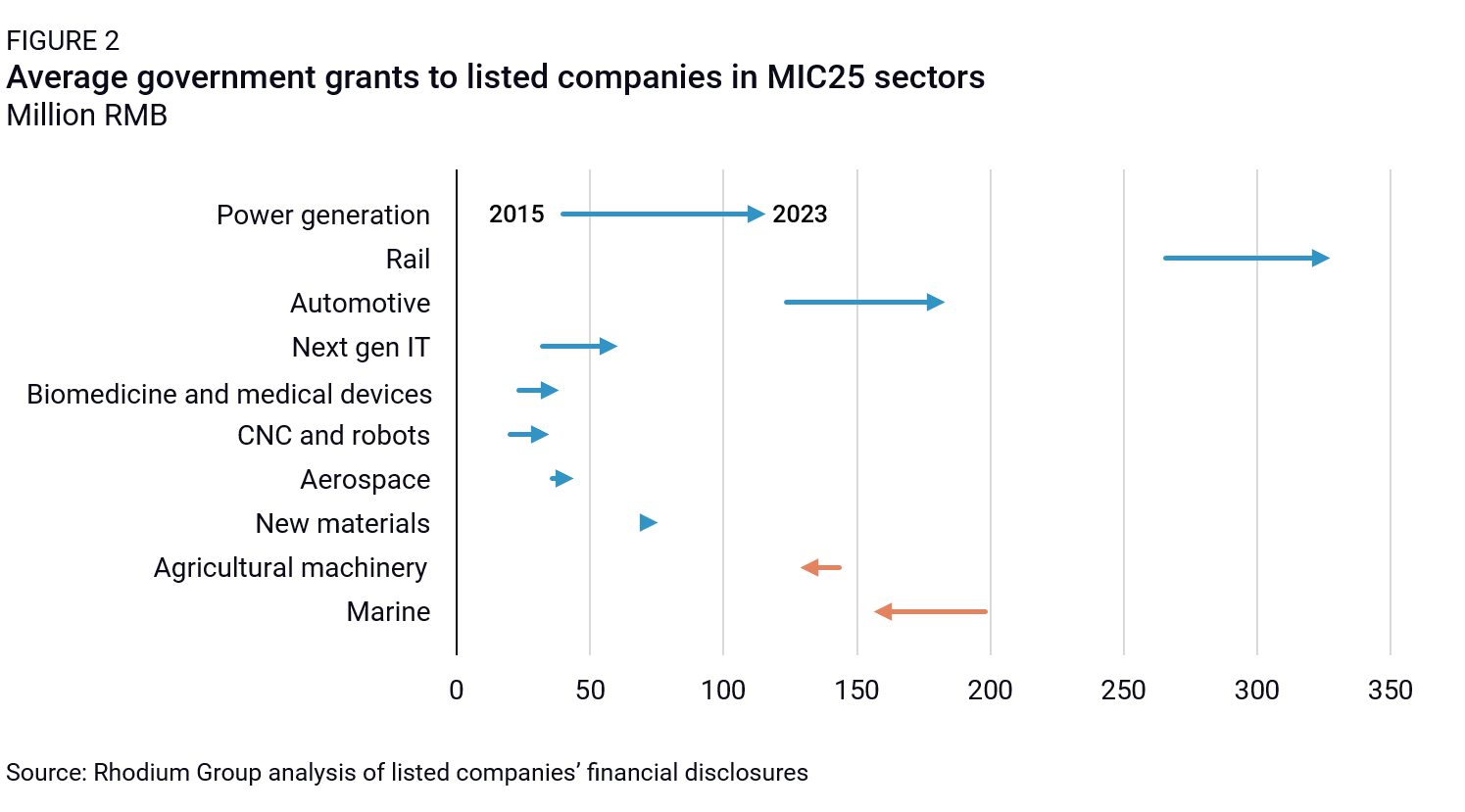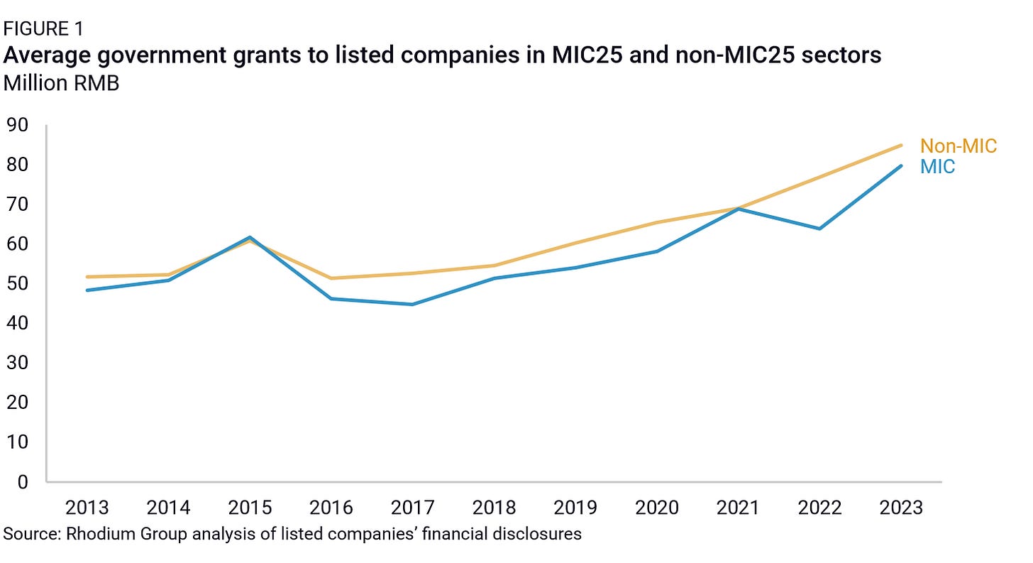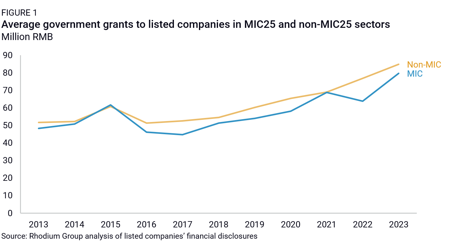 通过赠款提供的直接支持——中国产业政策冰山中最明显的一角——在这个生态系统中经历了最不令人印象深刻的增长。2015 年至 2023 年期间,政府对上市公司的平均补助增长了 80%,比往年更快,但低于中国的 GDP 增长。更重要的是,数据中看不到将资源重新集中到关键部门的预期。相反,非 MIC25 行业的公司(根据我们的估计,占 2023 年上市公司数量的 67%)似乎至少从政府补助的增加中受益(图 1)。