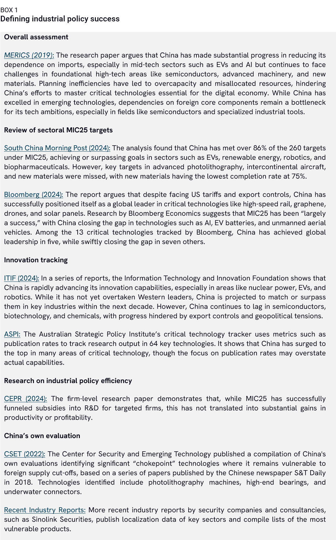 最后,本报告分析了 MIC25 的预期成就。第 2 章考察了第一个目标(减少中国的进口依赖)所取得的成就。第 3 章研究了第二个目标(减少中国对外国公司的依赖)所取得的成就。第 4 章研究了第三和第四目标(实现全球竞争力和成为全球市场的技术领导者)的成就。报告最后还研究了中国产业政策的意外影响,包括效率低下、产能过剩、财政和债务负担高以及对未来 GDP 增长的限制。