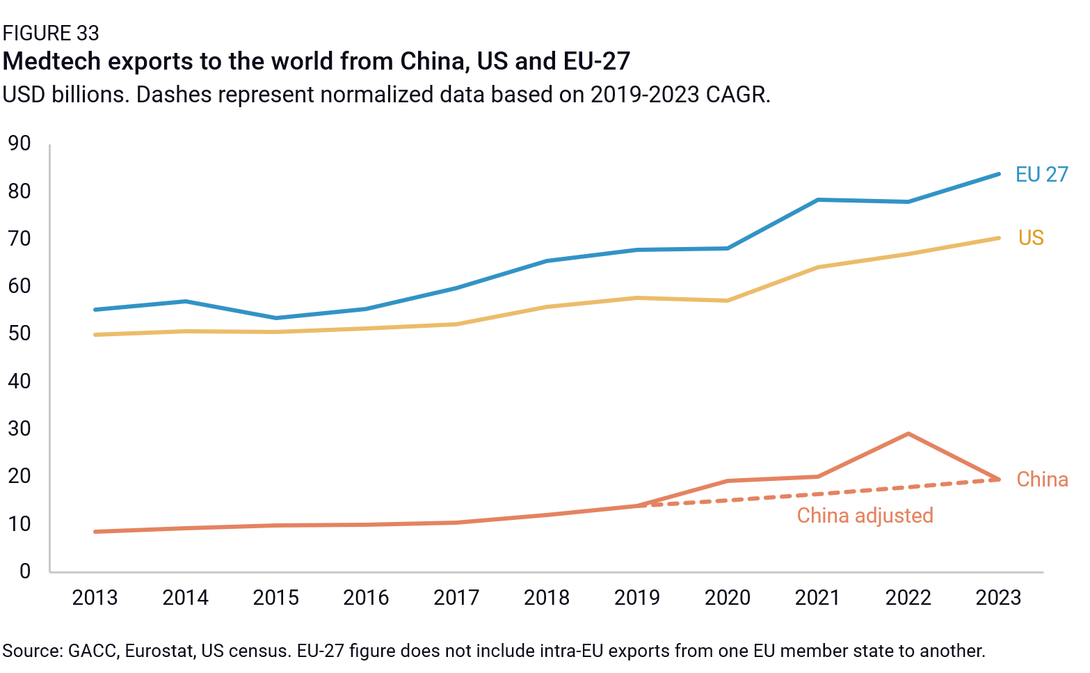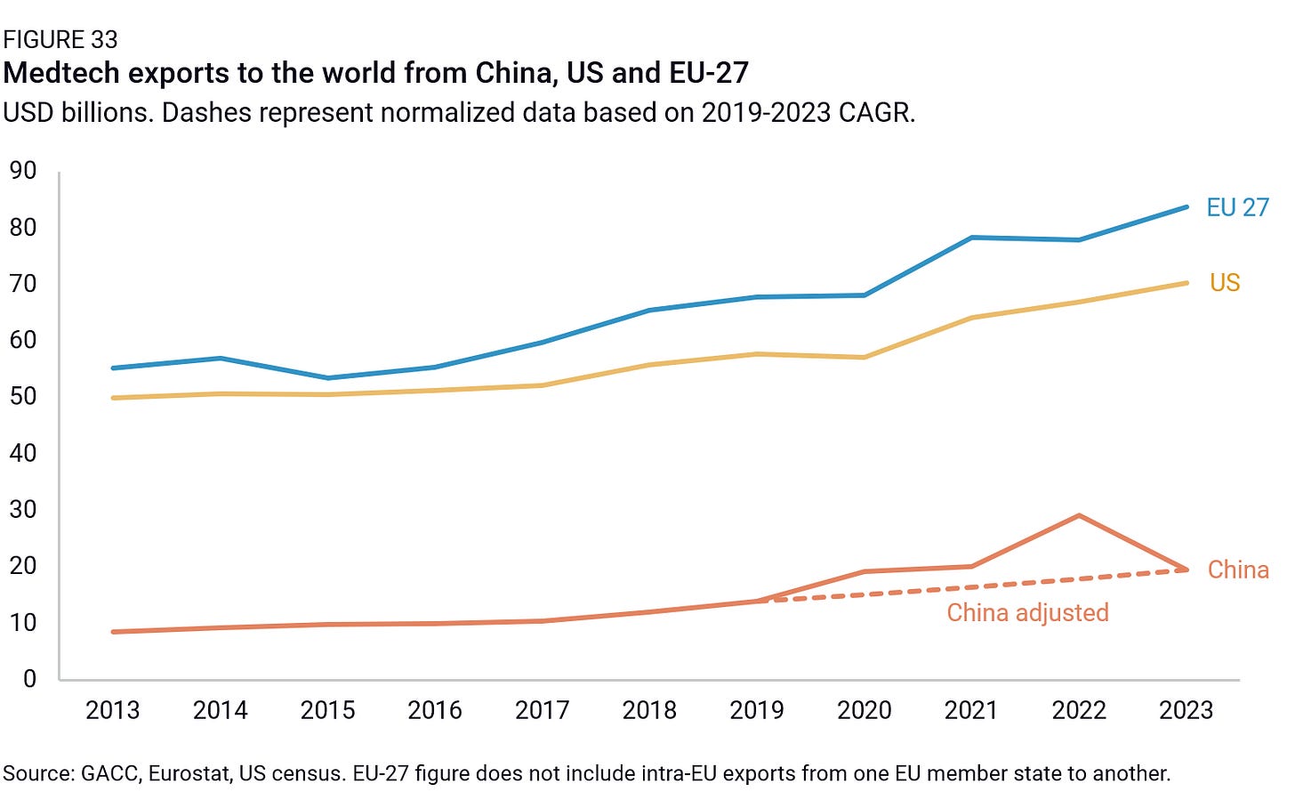 中国在医疗技术品类方面取得了一些进展,尤其是在低端领域,但总体而言,其迈向全球领导地位的目标才刚刚开始。截至 2023 年,中国的医疗技术出口仅占全球医疗技术出口的一小部分,占 5.6%,而美国为 20.3%,欧盟为 22.3%(图 33)。中国的出口在数量方面也更具优势,这表明中国在低价值和极具价格竞争力的产品(可能包括跨国公司在中国生产的产品)方面处于领先地位。
