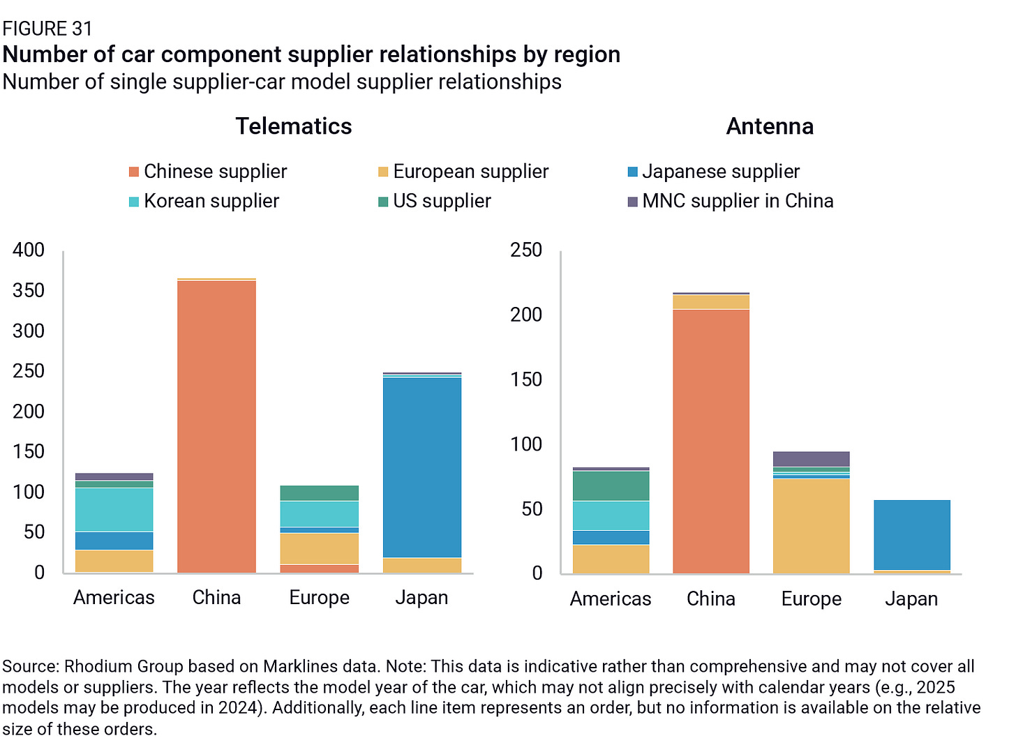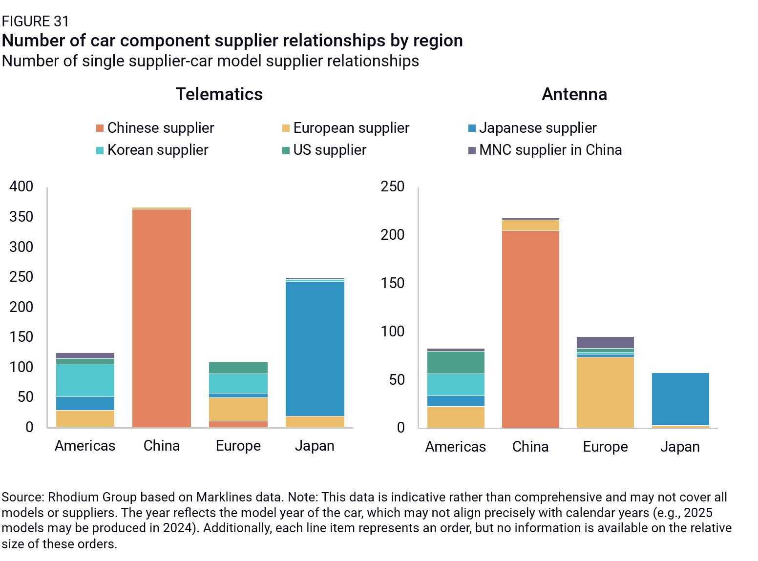 即使在中国供应商目前主导国内市场的领域,如远程信息处理和天线,他们也尚未开始渗透海外市场(图 31)。根据 Marklines 的数据,汽车中使用的传感器也是如此,中国公司已经主导了市场(见第 3 章),但 2023 年没有中国公司向在欧洲和美国生产的汽车制造商供货。这表明,在国内政策激励和优先考虑本地供应商的压力推动下的自给自足不会自动转化为全球竞争力,或者至少不会立即转化为全球竞争力。