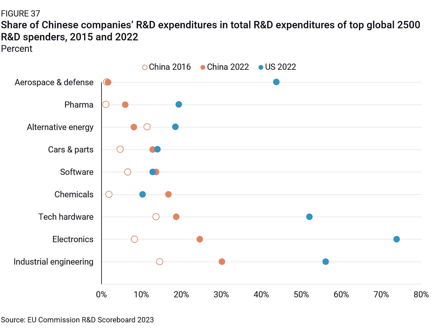 这种积极的画面受到其他指标的细微影响,包括研发支出。在过去十年中,全球研发支出最多的 2,500 家公司研发支出占研发总支出的份额有所增加,但在航空航天、制药、技术硬件、电子和工业工程方面仍大大落后于美国(图 37)。总体而言,2022 年工业企业的研发强度(研发支出与营业收入的比率)为 1.39%,制造业企业为 1.55%,分别高于 2013 年的 0.8% 和 0.88%。这仍然远低于美国所有公司的研发强度4.9%和制造商的5.1%。