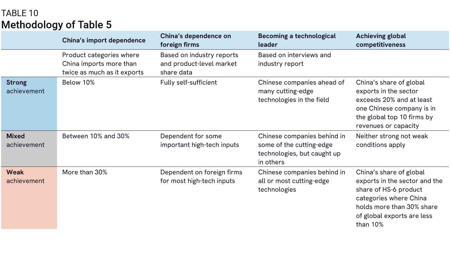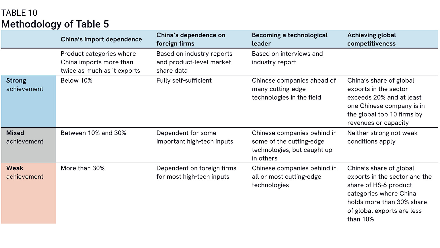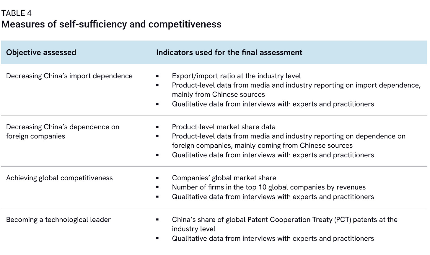 但是,所有这些支持真的让 MIC25 取得了成功吗?为了回答这个问题,本报告衡量了四个主要类别的结果:中国的进口依赖度、对外国公司的依赖度、全球竞争力和技术领先地位。