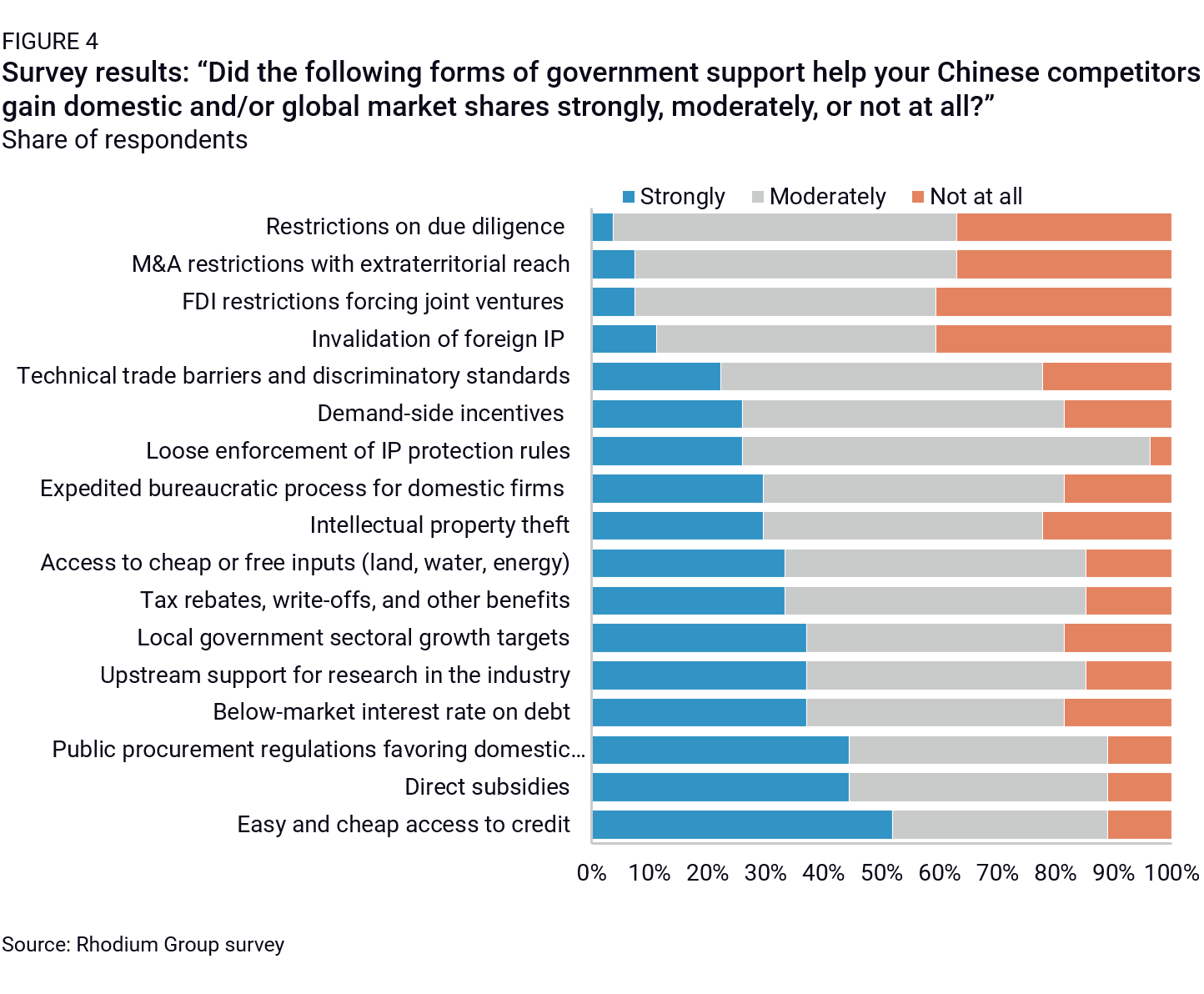 在我们对美国商会会员的调查中,受访者普遍认为中国政府的支持率在过去十年中有所增加(41% 的人表示强烈,另有 37% 的人表示适度)。受访者认为,获得信贷和低于市场水平的债务、直接补贴和有偏见的公共采购法规是帮助中国竞争对手获得市场份额的国家支持(图 4)。