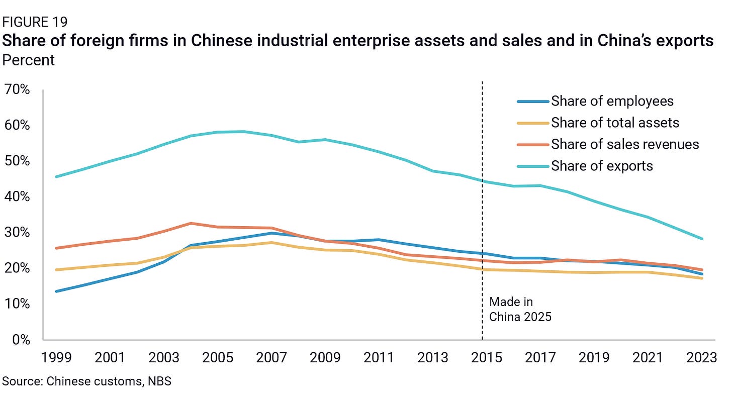 MIC25 在这一趋势中的作用尚不完全确定。一方面,保护主义和歧视性措施的兴起——MIC25战略的核心——可能阻止了一些公司在中国投资。尽管商业环境日益严峻,但中国不断增长的成熟市场、庞大的人才基础以及不断增长的本地参与者的竞争力,无疑也是推动外国公司实现生产和研究本地化的关键因素。