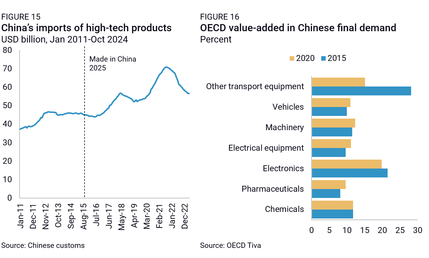 另一方面,新的挑战正在出现,有可能破坏这一势头。中国与其贸易伙伴之间日益加剧的摩擦加剧了其创新和工业生态系统的压力。在中国寻求缩小与全球知名领导者差距的行业,其进展可能会受到敏感行业日益增长的投资和出口限制的阻碍。与此同时,在突破性技术方面,中国面临着国际研究合作减少的额外限制,限制了其利用全球专业知识的能力。