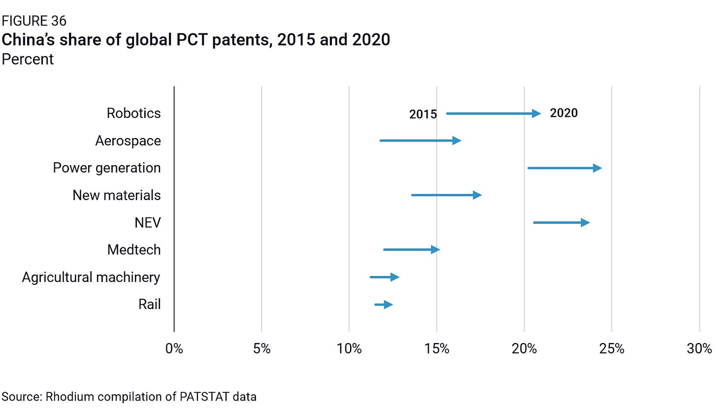 专利数据也显示出类似的势头。图 36 显示了 2015 年至 2020 年期间中国在全球 PCT 专利中的份额——这是一个提前截止日期,因为专利注册滞后于申请,从而使最近的数据出现偏差。根据我们的分析,中国在大多数行业的份额都有所增加,少数行业(新能源汽车、新材料、电子和机器人)的份额增长了 4 个百分点以上。在海洋工程和农业机械领域,中国在全球 PCT 专利中的份额是 MIC25 领域中中国在全球 PCT 专利中持续份额最低的类别。