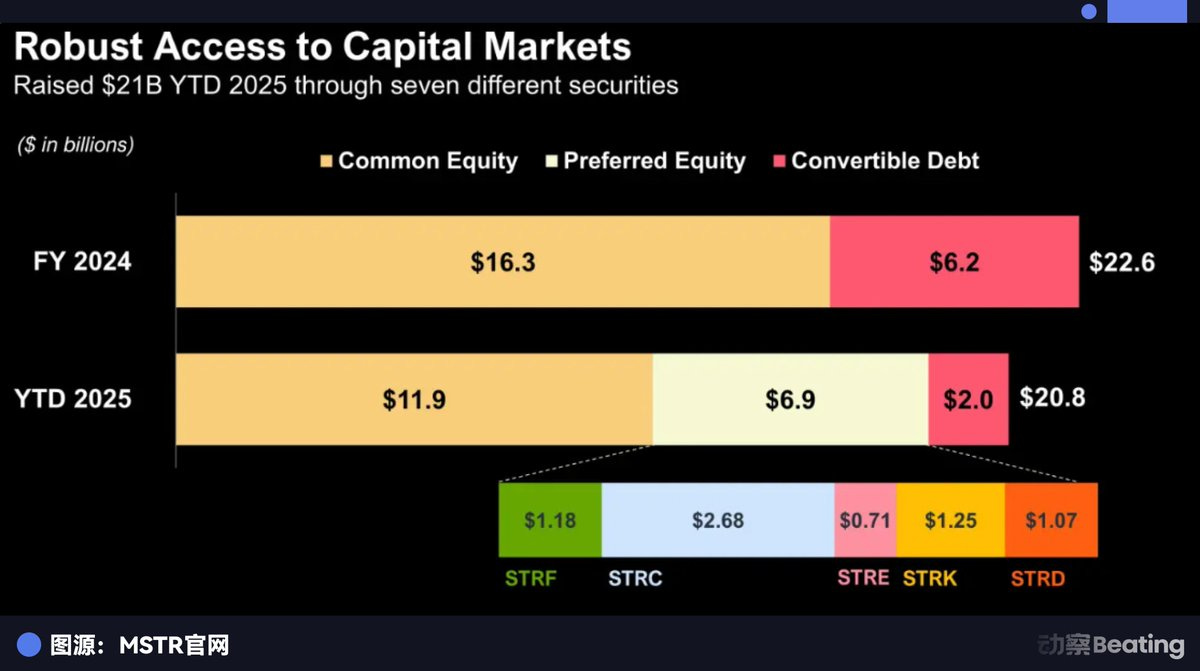 MSTR今年已募得 208 亿美元的高额资金,这个规模在美国上市公司的年度募资中极为罕见。 资金来源分别为普通股 MSTR 119 亿美元、优先股 69 亿美元、可转债 20 亿美元。